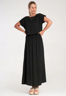 Dwuczęściowy komplet w eleganckim, czarnym kolorze to połączenie wygody i stylu. Składa się z krótkiej bluzki z opadającymi rękawami oraz długiej spódnicy z ...