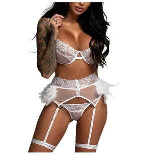 Zmysłowy komplet bielizny z koronką i piórkami – elegancja z nutą kokieterii Ten zestaw bielizny to idealne połączenie zmysłowości, kobiecego uroku i subteln...