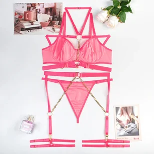 Lateksowy zestaw bielizny z łańcuszkami - Neonowy różowy M