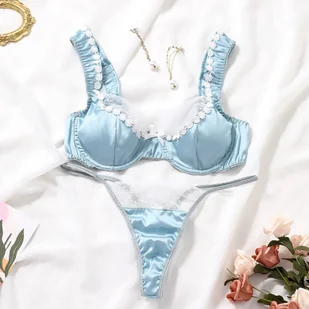 Satynowy komplet bielizny z naszywanymi kwiatuszkami - Niebieski XS