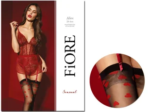 Wzorzyste pończochy do pasa Alice z czerwonymi aplikacjami w kształcie serc. Model nie posiada zaznaczonej części palcowej.