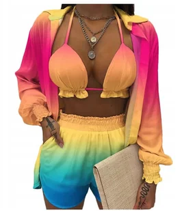 3 - Częściowy Strój Plażowy Szorty Koszula Stanik Bikini Tęczowy Ombre S
