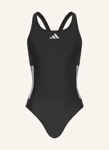 Średnie wycięcia na nogi. Całkowicie zakryte pośladki. Wycięcie z tyłu. Wzór w 3 paski. Odporny na chlor materiał Infinitex Fitness Eco