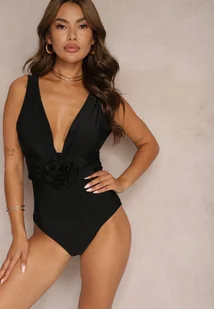 Czarny Strój Kąpielowy Jednoczęściowy Ozdobiony Aplikacją Kwiatu 3D z Usztywnieniem Seliris