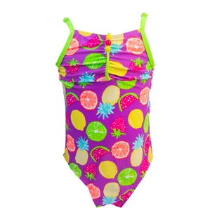 Dziewczęcy kostium kąpielowy jednoczęściowy w żywym fioletowym kolorze, ozdobiony wesołym nadrukiem kolorowych owoców, które nadają mu radosny i letni charak...