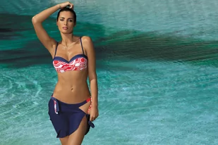 Zmysłowy, dwuczęściowy kostium w stylowej, marynistycznej kolorystyce. Oto modna aranżacja na plażę! Biustonosz wyróżniono efektowną, drukowaną tkaniną, ładnie podkreśla pierwszą opaleniznę. Linia dekoltu otulona granatową lamówką, wygląda bardzo seksownie. Usztywniane miseczki z fiszbinami i (wyjmowanym) wypełnieniem push up dbają o to, aby piersi były uniesione, przybliżone ku sobie i optycznie powiększone - w tym biustonoszu zyskują na atrakcyjnym, kobiecym wyglądzie. Ramiączka regulowane z możliwością ich całkowitego odpięcia. Biustonosz z tyłu jest wiązany na plecach. Figi wygodnie wiązane po obu stronach bioder, z pewnością dobierzesz ich rozmiar to swoich potrzeb. Tego lata po prostu wyglądaj i czuj się wspaniale! Produkt najwyższej jakości, potwierdzony hologramem,uszyty z włoskiej tkaniny Carvico Tessuti, odporny na działanie promieni słonecznych, siłę trącą piasku, doskonale kryjący ciało, szybkoschnący.