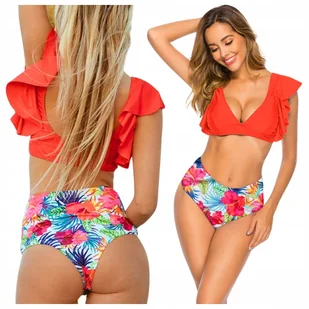 wielokolorowy (motyw kwiatowy) rozmiar: M model: dwuczęściowy kostium kąpielowy góra: biustonosz z falbanką, podwójny materiał, wyjmowane wkładki usztywniające majtki: z wysokim stanem, elastyczny materiał materiał: wysokiej jakości, nieprześwitujący, elastyczny przeznaczenie: