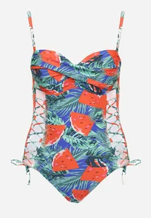 Niebiesko-Czerwony Strój Kąpielowy z Motywem Liści i Wiązaniem Nevalitfe