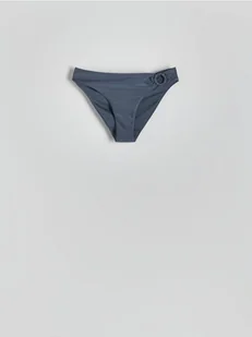 Majtki plażowe z ozdobnymm elementem, wykonane z gładkiego materiału.
