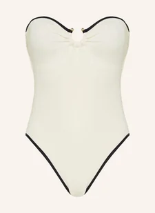Wysokie wycięcia na nogi. Całkowicie zakryte pośladki. Ozdobny pierścień wzłotym kolorze z przodu. Kontrastowe paski na krawędziach. Wzór strukturalny