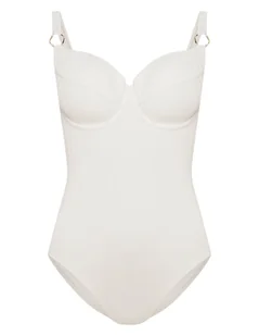Strój jednoczęściowy Pearl będzie idealną propozycją na plażę, jeśli chcesz wyglądać fenomenalnie. Usztywniana góra z fiszbinami dla podtrzymania piersi. W całości uszyty ze strukturalnej tkaniny. Ramiączka z ozdobnym kółeczkiem w złotym kolorze. regulowany obwód pod biustem