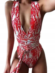 WIĄZANY JEDNOCZĘŚCIOWY STRÓJ KĄPIELOWY Z DEKOLTEM CZERWONY ZWIERZĘCY XL