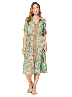 TEMU Elektryczna Sukienka Midi z Geometrycznym Wzorem i Bufiastymi Rękawami dla Kobiet - Pomarańczowy/Turkus/Czarny/Biały/Zielony, Okrągłe Dekolt,