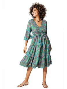 Sukienka w kolorze turkusowo-różowym - czysta wiskoza - dekolt: V - długość rękawa: 3/4 - talia: ściągacz tunelowy - krój: litera A - wzór: