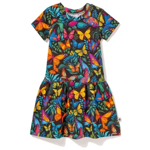 Bawełniana sukienka z krótkim rękawem Kolorowe Motyle na czarnym 128/134