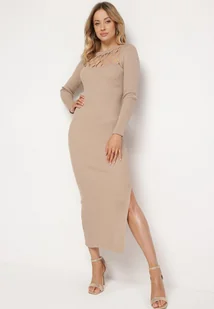 Beżowa Dopasowana Sukienka z Prążkowanego Materiału z Ażurowym Dekoltem Medna