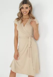 Beżowa Kopertowa Sukienka Midi Wiązana w Talii Mayella
