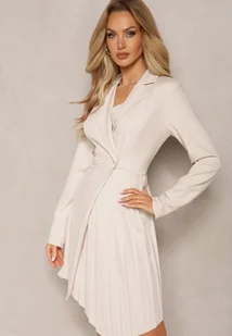 Beżowa Mini Sukienka z Plisami i Kopertowym Dekoltem Ozdobiona Guzikami Eiloni