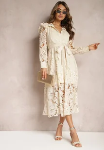Beżowa Rozkloszowana Sukienka o Koszulowym Fasonie z Falbanką i Koronką Caramia