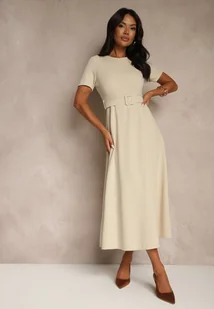 Beżowa Sukienka o Rozkloszowanym Kroju z Ozdobnym Paskiem Desiliena