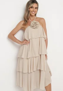 Beżowa Sukienka z Falbanami Wiązana na Szyi z Broszką Kwiatem Tinallena