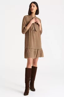Beżowa sukienka z szarfą przy dekolcie, nadruk w kratkę - Greenpoint