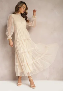 Beżowa Tiulowa Sukienka Maxi ze Wstawkami z Koronki i Ozdobnymi Guzikami Aovena