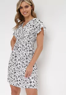 Biała Kwiecista Sukienka Mini z Wiskozy z Marszczoną Gumką w Pasie Catela