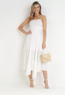 Biała Maxi Rozkloszowana Sukienka ze Zdobieniami z Koronki i Troczkiem Elenime