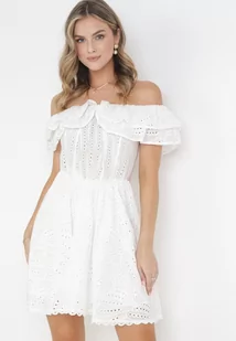 Biała Rozkloszowana Sukienka Mini Hiszpanka z Gumką w Pasie i Ozdobnym Haftem Lenia