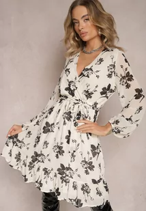 Biała Rozkloszowana Sukienka Mini w Kwiaty i Gumką w Pasie Elandri