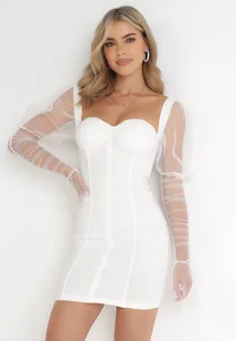 Biała Sukienka Dopasowana z Marszczeniem i Bufiastymi Rękawami Farnia