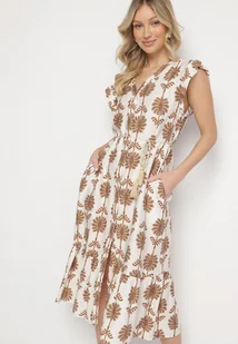 Biało-Beżowa Kwiatowa Sukienka z Bawełną i Falbanką Efanelia