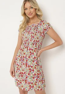 Biało-Czerwona Wiskozowa Sukienka w Kwiaty Typu Hiszpanka z Gumką w Talii Revemia