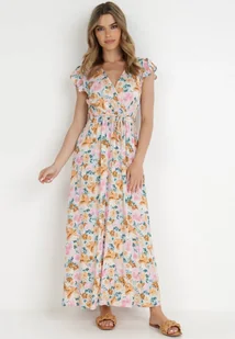 Sukienka Iraris w duże kwiaty. Model o długości maxi i lekko rozkloszowanym fasonie. W pasie wszyta elastyczna gumka. Kopertowy, głęboki dekolt. Bez rękawów, z falbankami przyszytymi wokół ramion.