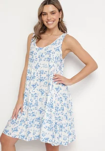 Biało-Niebieska Rozkloszowana Sukienka z Bawełny z Kwiatowym Wzorem Anniviana