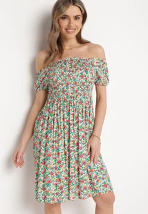 Biało-Zielona Sukienka z Wiskozy w Kwiaty z Hiszpańskim Dekoltem Latiana