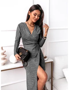 Błyszcząca suknia z długim rękawem MILI - srebrna Olśniewająca sukienka przekładana z kolekcji Shine to idealna propozycja na większe wyjście, kiedy chcesz błyszczeć i zachwycać. Wykonana z miękkiego, połyskującego materiału, pięknie mieni się w świetle, podkreślając każdy ruch. Kobiecy, dopasowany krój z kopertowym dekoltem subtelnie eksponuje biust i wysmukla sylwetkę, a marszczenie w talii dodaje lekkości i elegancji. Zmysłowe rozcięcie na nodze sprawia, że całość nabiera wyrafinowanego, glamour charakteru. To sukienka, w której poczujesz się wyjątkowo – niezależnie czy wybierasz się na kolację, przyjęcie czy świąteczną imprezę.