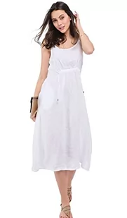 Bonateks damska sukienka 100% lniana wyprodukowana we Włoszech, długa sukienka z koronką z przodu i kieszeniami, biała, rozmiar: L, biały, L