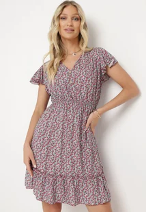 Bordowa Bawełniana Rozkloszowana Sukienka w Kwiaty z Falbanami i Gumką w Talii Nelyse