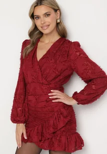 Bordowa Kopertowa Sukienka Koronkowa z Bufiastymi Rękawami Falbankami i Marszczeniem Demeriana