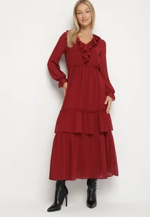 Bordowa Siateczkowa Sukienka VICES o Rozkloszowanym Kroju z Falbanami Arevite