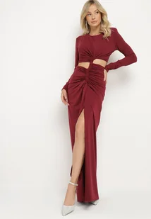 Bordowa Sukienka Koktajlowa Ozdobiona Wycięciem Marszczeniem w Talii i Rozcięciem na Nogę Ilizia