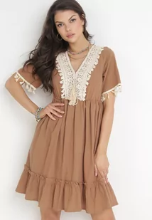 Brązowa Rozkloszowana Sukienka Mini z Gumką w Pasie i Ozdobnym Dekoltem Lilinia