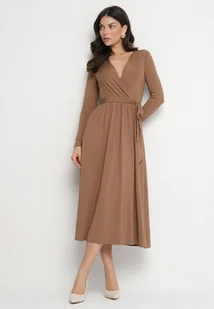 Brązowa Sukienka Kopertowa z Wiskozą Wiązana w Talii Drestalia