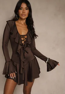 Brązowa Sukienka o Taliowanym Kroju z Falbanami Tiseania