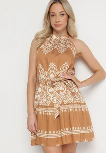 Brązowa Sukienka z Odkrytymi Ramionami i Paskiem w Stylu Boho Tdivisa