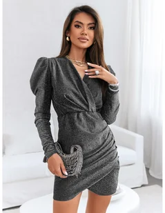 Brokatowa sukienka z kopertowym dekoltem ZAKIA -srebrna Odkryj czarujący blask brokatowej sukienki ZAKIA, która jest przeznaczona dla każdej kobiety pragnącej poczuć się wyjątkowo i olśniewająco na specjalne okazje. Ta sukienka to synonim elegancji z nutą nowoczesności, która sprawia, że każda chwila staje się niezapomnianym wydarzeniem. Przekładany dekolt w kopertowym stylu pięknie eksponuje szyję i dekolt, a gumka w pasie subtelnie podkreśla talię, modelując sylwetkę i dodając jej gracji. Bufiaste rękawy są nie tylko elementem trendy, ale także zapewniają komfort noszenia i swobodę ruchów. Delikatne marszczenie po boku sukienki od pasa w dół dodaje struktury i nowoczesnego charakteru.