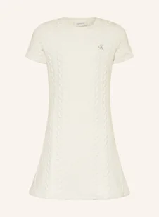 Dla dziewczynek. Warkoczowy splot. Krój dopasowany w talii z lekko rozszerzaną spódnicą. Okrągły dekolt. Krótkie rękawy. Elastyczny materiał. Haft z marką z przodu