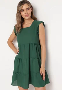 Ciemnozielona Rozkloszowana Sukienka z Falbankami Zapinana przy Szyi Rettesa